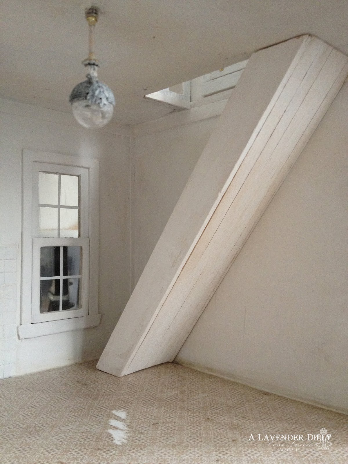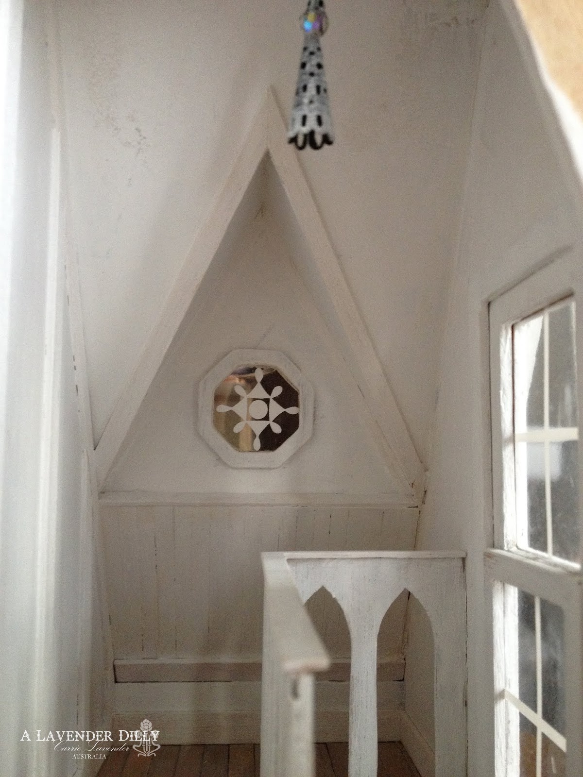 I used LED lighting for this house. I have used them in the past for smaller 1/144 projects but never on this scale. I always have a stash of electric lights to use and usually go that route. I am so used to using electric lights and installing those that it also took a while to get my head around using LED. They are very easy to use and you get to be creative with making your own light fixtures. I had to lengthen all the wires for starters as I get them in shorter lengths. A lot of twisting wires together and heat shrink tubing was used. If your exposed wires touch each other then they wont work. I like to play it safe. I also need to get myself a better wire stripper. I've always just used my finger nails in the past but it got a bit painful after a while. I use Nano lights. They are teeny and so much easier to wire into jewelry findings etc that I use for light fixtures. They still give enough light I think. I dont like my lights to be too strong. I get the cool white and purchase the orange and red for the fireplace. The warm white can be a bit yellowing sometimes. The light fixture in the kitchen is a pendant. I threaded the Nano inside then used a spacer and the white plastic tubing from a cotton bud and then another spacer. Drilling a hole in the timber for the wire made some of it split and come away so I hid that using white paper circle punched out with a 9mm punch to act like a ceiling rose. Then painted it all white.