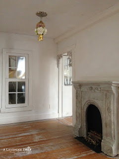 For the fire place I used flicker Nano in orange and red. I lightly twisted them together rather than gluing them. I arranged some sticks from my garden and glue them over the Nano lights. I pushed some red glass beads into the glue while it is setting. For the fire grate I bent the ends of a long brass finding at right angles and glued it onto a piece of black card. The pile of sticks fits tightly inside it. Then I just slid it all into the fire place with the wires disappearing down the hole I had made at the back. The light fixture I made using a large light pink pandora bead and a cone brass finding. Some fabric roses, more plastic tubing and a large bead cap for the ceiling rose.