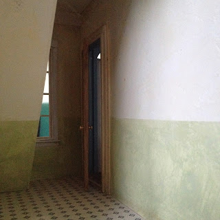 Here I used some pieces from a sandalwood fan for the dormer trim. Laser cut trim I used for the shelf over the bed and RL picture frame molding at each and of the bed space. It helps to hold the mattress in place but allows space for me to add bedding. The little wardrobe needs hardware still. To make it I used scraps of large balsa to make a box. Cut strips of 1mm balsa and glued them to the outside. For the front a strip on each side and narrower ones along the top and bottom. Strips for the door but there would be some space around. Before I glued them down I went around with a black Sharpie so that when the strips are down it would look as though there is space inside the wardrobe. Some cornice trim along the top. For the light I used flower style bead cap, pink pandora bead and a 1/12 scale juice glass. I left the twisted wires to show but painted them white.